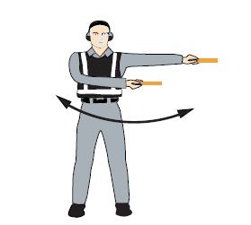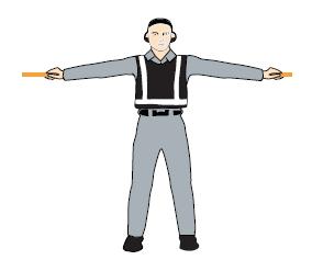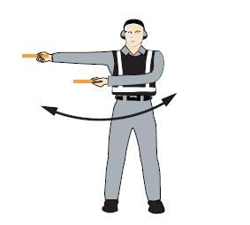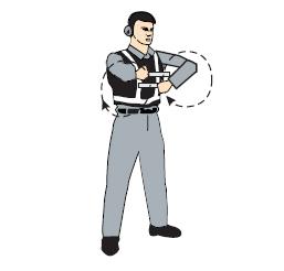 雙臂水平外伸,掌心朝下,向下招手,雙臂移動速度表示上升率大小 向下移動(下降高度) 一臂水平指向右側(cè), 另一臂反復向所指方向揮動,示意直升機應向左移動(轉(zhuǎn)向)向左移動(轉(zhuǎn)向) 一臂水平指向左側(cè), 另一臂反復向所指方向揮動,示意直升機應向右移動(轉(zhuǎn)向)向右移動(轉(zhuǎn)向)