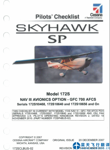 北京藍天飛行翻譯公司承接大型通航公司的塞斯納172S飛行員檢查單翻譯任務 Cessna 172S Pilots' Checklist Translation