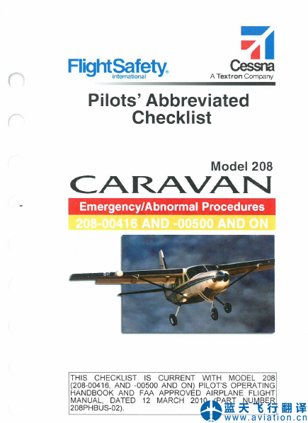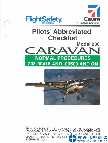 北京藍天飛行翻譯公司承接大型通航公司的塞斯納208簡易檢查單翻譯任務(wù),塞斯納208簡易檢查單包含有正常程序和應(yīng)急/非正常程序,Cessna 208 CARAVAN Pilots’ Abbreviated Checklist Translation