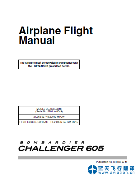 北京藍(lán)天飛行翻譯公司完成公務(wù)機(jī)公司的第34版龐巴迪挑戰(zhàn)者605全套飛行手冊(cè)翻譯任務(wù) REVISION 34: Sep 03/15 Bombardier Challenger 605 Flight Manual Translation 第34版龐巴迪挑戰(zhàn)者605飛機(jī)飛行手冊(cè) Bombardier Challenger 605 Airplane Flight Manual