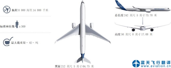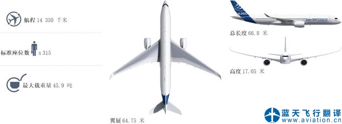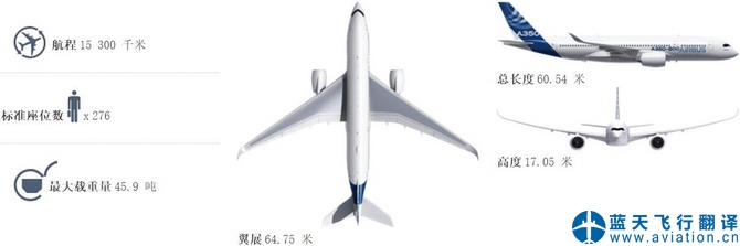 空中客車 A350-800 尺寸 總長度 60.54 米 客艙長度 -- 機(jī)身寬度 5.96 米 最大客艙寬度 5.61 米 翼展(幾何體) 64.75 米 高度 17.05 米 輪距 10.60 米 輪軸距 24.86 米 容量