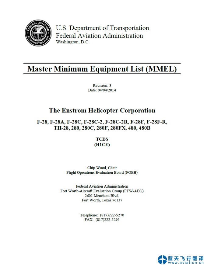 北京藍天飛行翻譯公司完成恩斯特龍480B直升機主最低設(shè)備清單翻譯任務(wù) Enstrom Helicopter Master Minimum Equipment List (MMEL) Translation 主最低設(shè)備清單(Master Minimum Equipment List)主要內(nèi)容包含有空調(diào)、自動飛行、通訊、電源、設(shè)備/裝飾、防火、燃油、冰雨防護、儀表、燈光、導(dǎo)航、氧氣、艙門、主旋翼傳動、動力裝置、發(fā)動機、指示等系統(tǒng)的部件說明、安裝數(shù)量、放行所需數(shù)量、備注和例外等 ![]() 恩斯特龍直升機主最低設(shè)備清單 Enstrom Helicopter Master Minimum Equipment List |