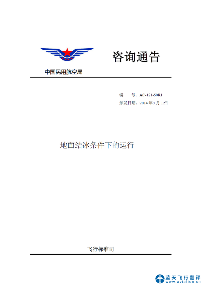 北京藍(lán)天飛行翻譯公司承接中國民用航空局飛行標(biāo)準(zhǔn)司地面結(jié)冰條件下的運(yùn)行咨詢通告翻譯 CAAC Advisory Circular Translation: Ground Operation In Icing Conditions ![]() 地面結(jié)冰條件下的運(yùn)行咨詢通告 地面結(jié)冰條件下的運(yùn)行咨詢通告的內(nèi)容包含有: 中國民用航空局咨詢通告