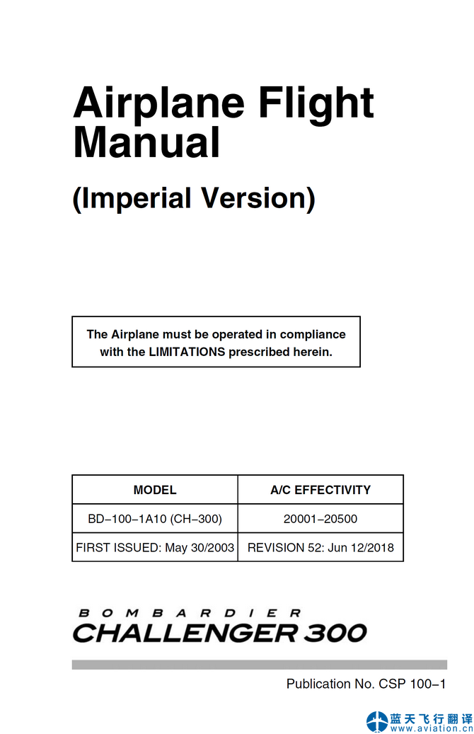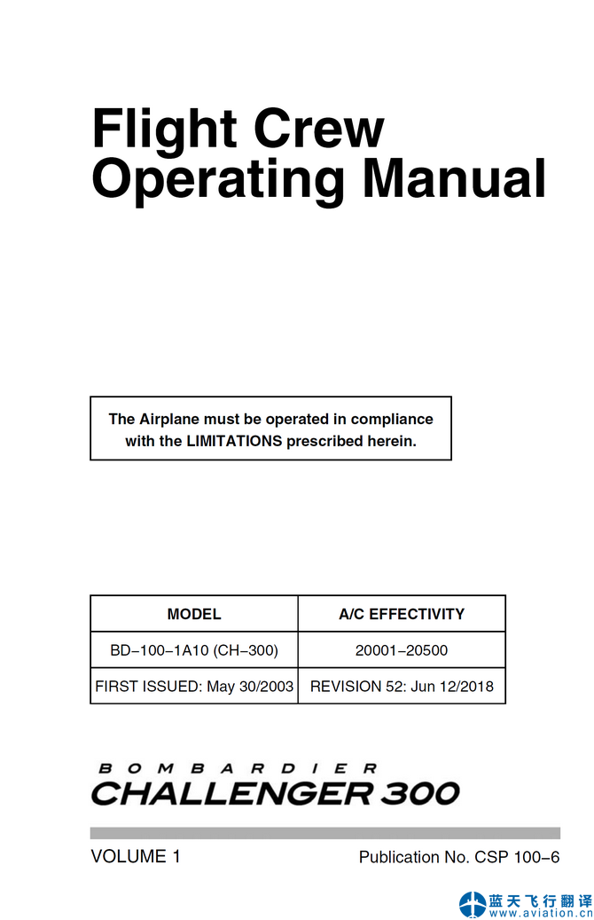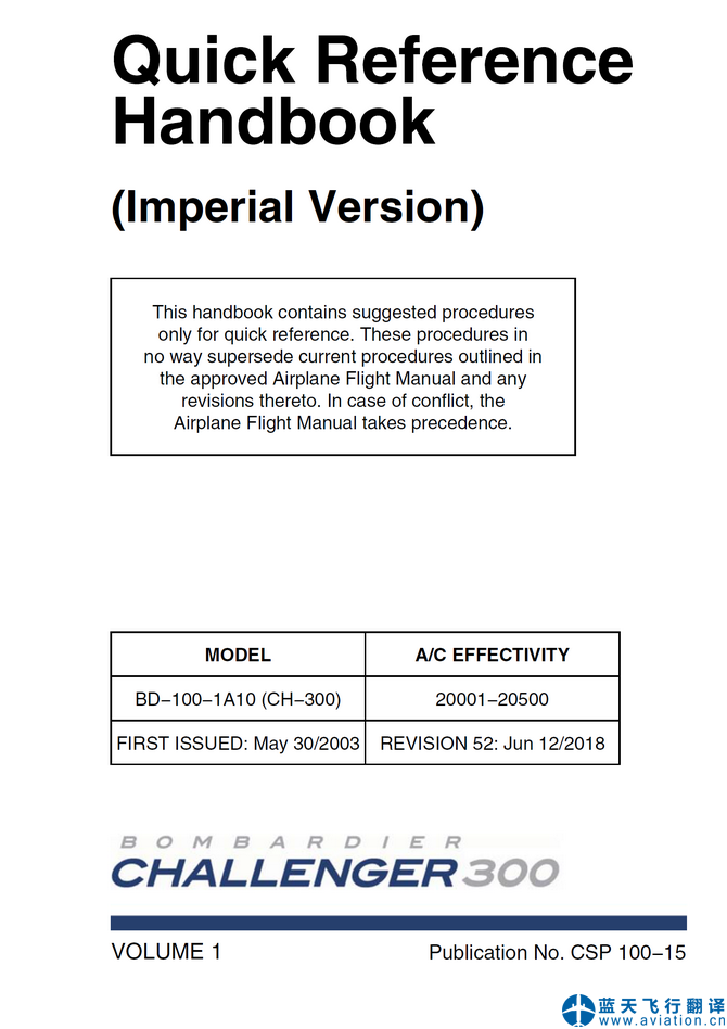 北京藍天飛行翻譯公司承接公務機公司2018年6月12日第52版龐巴迪挑戰(zhàn)者300公務機全套飛行手冊翻譯任務 REVISION 52: Jun 12/2018 Bombardier Challenger 300 Flight Crew Operating Manual, Airplane Flight Manual and Quick Reference Handbook Translation