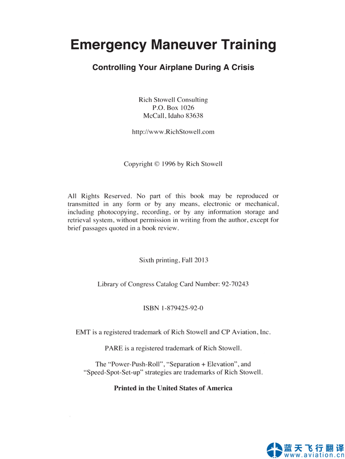藍天飛行翻譯公司承接大型航校緊急機動飛行訓練手冊翻譯任務 Emergency Maneuver Training Manual Translation ![]() ![]() 緊急機動飛行訓練手冊 Emergency Maneuver Training Manual 緊急機動飛行訓練手冊(Emergency Maneuver Training Manual)的主要內容包含有: Emergency Maneuver Training Basic Aerodynamics Steady Flight Important Ratios Roll, Yaw, and Pitch Roll Yaw Pitch Secondary Roll Effects Secondary Yaw Effects Secondary Pitch Effects Pitch and Power Energy Management The Power Curve Curved Flight Forces in Turns G-Loads The V-g Diagram Helpful Hints Shallow Turns Medium Turns Steep Turns Climbing & Descending Turns Skidding Turns Slipping Turns Turn/Roll Combinations Spirals Final Thoughts Stalls Flying the V-g Diagram Aerodynamic Cues Mechanical Cues Physiological Cues Approach-To-Landing Stall Departure Stall Under-The-Bottom Stall Over-The-Top Stall Prolonged Stall Deep Stall Tail Stall Stall Speed vs. C.G. Flaps Final Thoughts Spins Spin Dynamics Incipient Developed Recovery Inertia Effects Wing Design Fuselage Design Tail Design Pilot-Controlled Variables Power Ailerons Flaps Rudder Elevator Procedure vs. Technique Accelerated Spin Transition Spin Cross-Over Spin Pilot-Induced Flat Spin Overbanked Roll Dynamics V-p & V-g Diagrams Power Push Roll Managing The Airspeed In The Pattern Invisible Tornadoes Aircraft Configuration Effects Atmospheric Effects Separation Elevation Be Prepared Control Failures Ailerons Rudder Elevator Flaps Flutter Glides Weight Wind Turning Flight Airplane Configuration Judging Glide Distance The Glide Envelope Powerplant Failures Power Loss Speed Spot Set-up Loss Of Power Control Off-Airport Landings Engine Restart Evaluating Your Options Flying the Approach The Touchdown The Pilot In Command Situational Awareness Judgment Hazardous Attitudes Stressors See And Be Seen It’s Up To You For More Information EMT® Program Syllabus Bibliography |