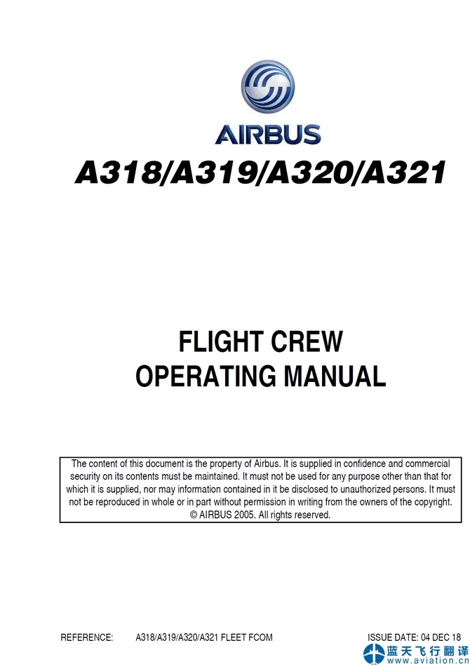 北京藍(lán)天飛行翻譯公司完成航空公司2018年12月4日版本空客A321和A320全套飛行手冊(cè)翻譯任務(wù),包含有A321和A320飛行機(jī)組操作手冊(cè)、快速檢查單、飛機(jī)飛行手冊(cè)。04 DEC 18 Airbus A321 and A320 FLIGHT CREW OPERATING MANUAL, QUICK REFERENCE HANDBOOK and AIRPLANE FLIGHT MANUAL Translation 藍(lán)天飛行翻譯公司本次翻譯的A321和A320空客飛行手冊(cè)包含A321-211和A320-216構(gòu)型。飛行機(jī)組操作手冊(cè)(FLIGHT CREW OPERATING MANUAL)和快速檢查單(QUICK REFERENCE HANDBOOK)為2018年12月4日版本,飛機(jī)飛行手冊(cè)(AIRPLANE FLIGHT MANUAL)為2019年3月22日版本。 ![]() A320飛行機(jī)組操作手冊(cè) A320 FLIGHT CREW OPERATING MANUAL ![]() A320快速檢查單 A320 QUICK REFERENCE HANDBOOK ![]() A320飛機(jī)飛行手冊(cè) A320 AIRPLANE FLIGHT MANUAL