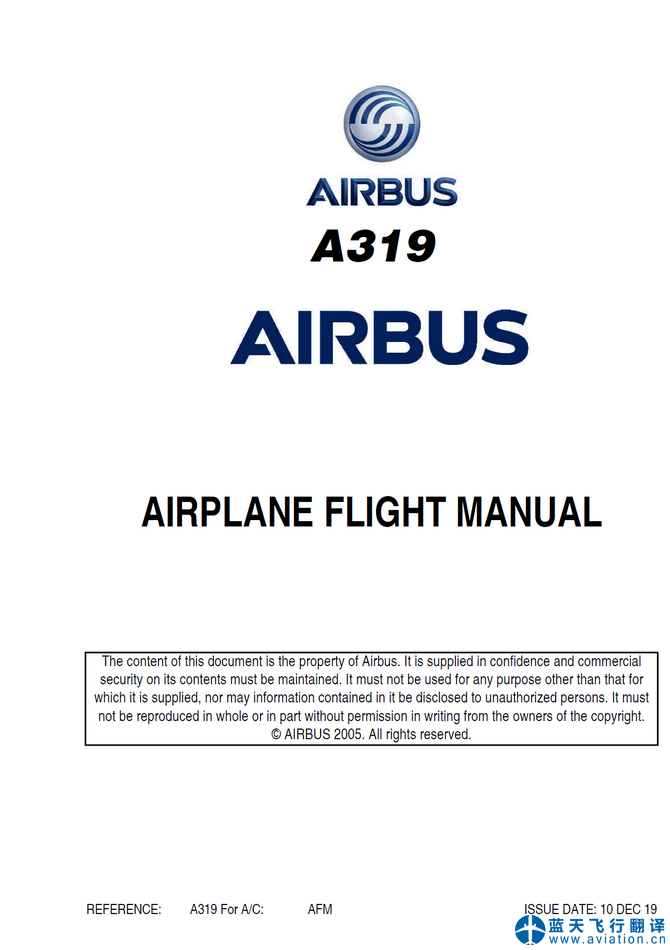 本次翻譯的ACJ319構(gòu)型為319-115,ACJ319飛行機(jī)組操作手冊和ACJ319快速檢查單修訂日期為2019年12月11日,ACJ319飛機(jī)飛行手冊修訂日期為2019年12月10日。