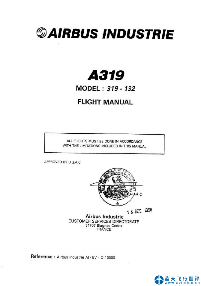 北京藍(lán)天飛行翻譯公司完成航空公司11架空客A319/A320飛行機(jī)組操作手冊(cè)(FCOM FLIGHT CREW OPERATING MANUAL)和AFM飛機(jī)飛行手冊(cè)(AFM AIRPLANE FLIGHT MANUAL)翻譯任務(wù) 11 DEC 19 A319/A320 FLIGHT CREW OPERATING MANUAL and AIRPLANE FLIGHT MANUAL Translation