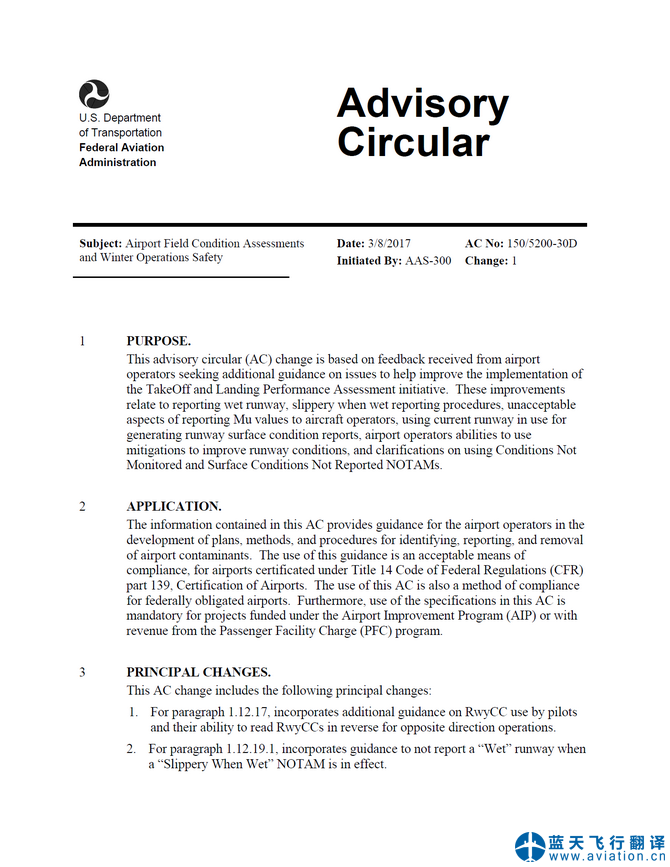 北京藍天飛行翻譯公司承接大型航校的FAA咨詢通告機場條件評估和冬季運行安全翻譯任務 FAA Advisory Circular Airport Field Condition Assessments and Winter Operations Safety Translation
