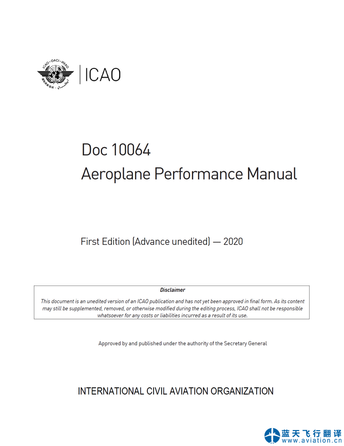 北京藍(lán)天飛行翻譯公司承接國際民航組織飛機(jī)性能手冊翻譯任務(wù) INTERNATIONAL CIVIL AVIATION ORGANIZATION, Aeroplane Performance Manual Translation
