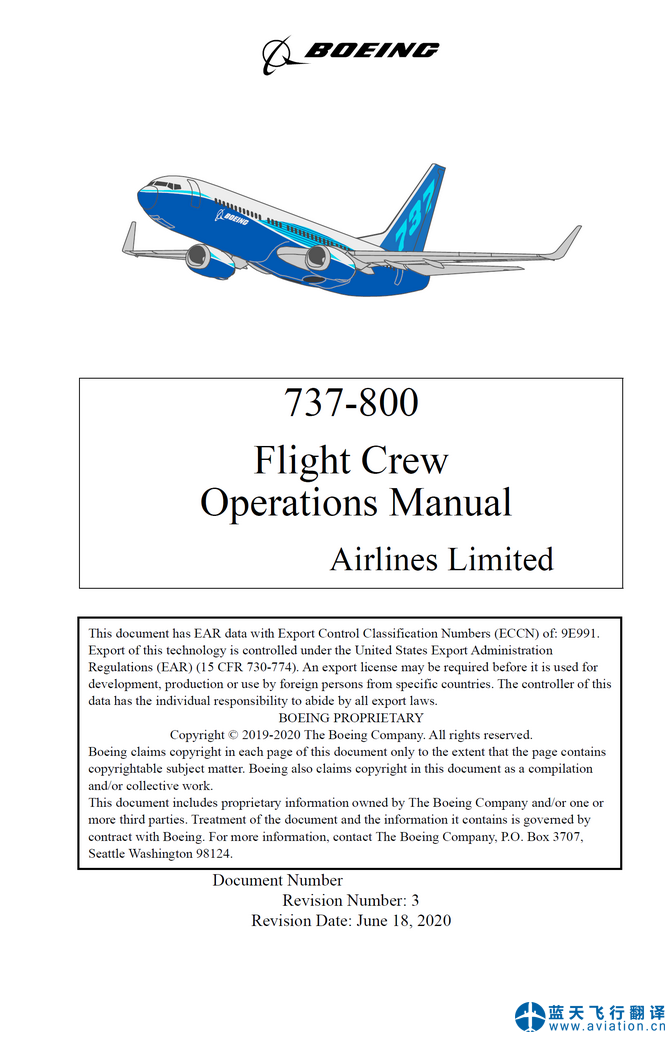 北京藍(lán)天飛行翻譯公司本次翻譯的波音737-800飛行機組使用手冊(Flight Crew Operations Manual)和快速檢查單(Quick Reference Handbook)版本日期為2020年6月18日,包含5架波音737-800飛機。