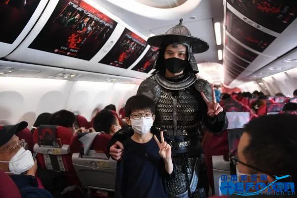 電影角色扮演者在客艙內(nèi)與小旅客合影 航行期間,客艙廣播為旅客播報電影相關引導互動式廣告,空乘還化身劇中角色與旅客互動,沉浸式營造空中探案氛圍。此外,角色扮演者還身穿禁軍磐龍營副將鄭萬的盔甲驚喜亮相客艙,為互動旅客帶來精美周邊禮品。