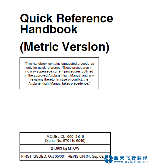 北京藍(lán)天飛行翻譯公司完成公務(wù)機(jī)公司的第34版龐巴迪挑戰(zhàn)者605全套飛行手冊(cè)翻譯任務(wù) REVISION 34: Sep 03/15 Bombardier Challenger 605 Flight Manual Translation 第34版龐巴迪挑戰(zhàn)者605飛機(jī)飛行手冊(cè) Bombardier Challenger 605 Airplane Flight Manual